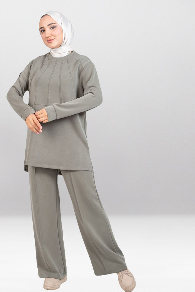 Şık kesim ve detaylar: 95 cm’lik pantolon boyu ve tunik boyu 80 cm ile modern görünüm. Lastikli bel ve geniş kesim pantolon, hareket özgürlüğü sunar.
