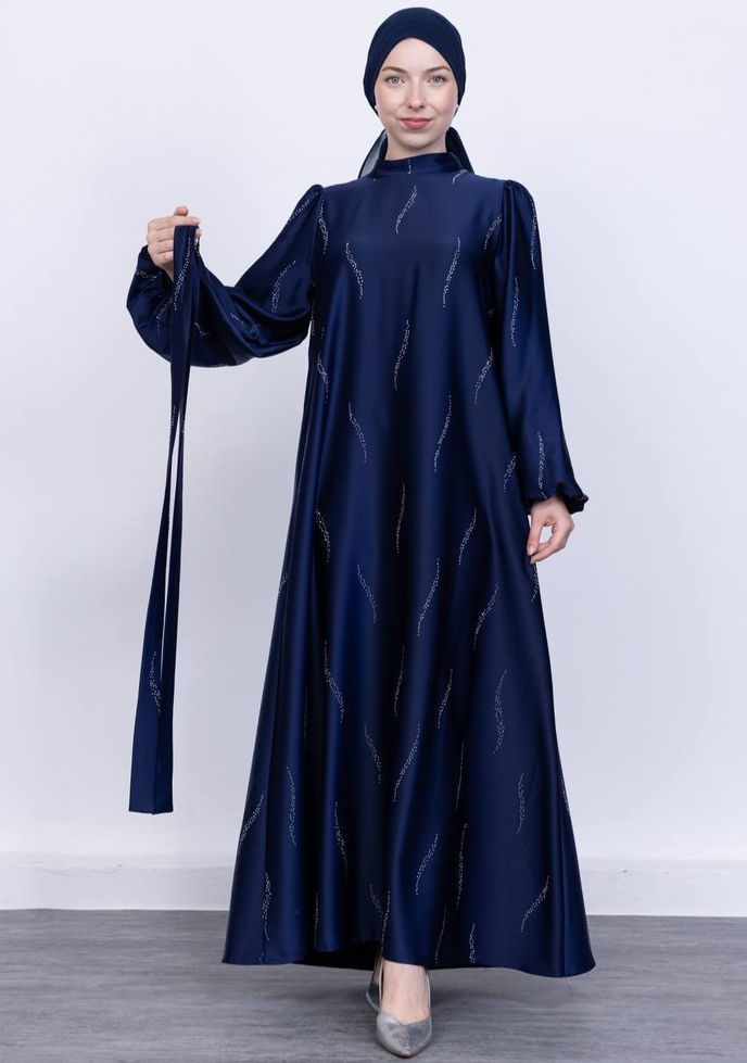 Parıltıyı ve zarafeti bir arada sunan taş detaylı saten elbisemiz, özel günleriniz için kusursuz bir tercih. Saten kumaşın akıcı parlaklığına eşlik eden zarif taş işlemeleri, elbiseye göz alıcı bir ışıltı katıyor. Şık kesimiyle vücudu zarifçe sararken, taş detaylarıyla her adımda ışıltınızı yansıtıyor.